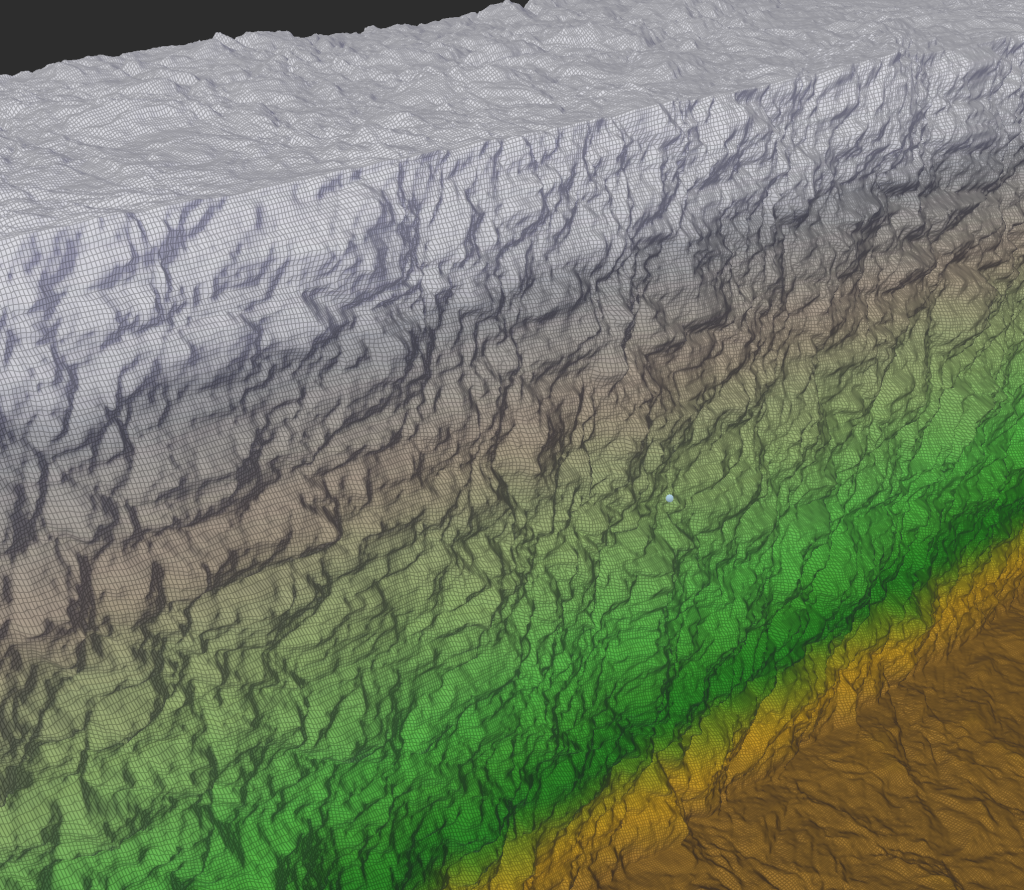 Heightfields have yet another related problem that becomes ugly at fine scales: They use a top-down, worldspace projection. You give me (X,Y), and I tell you Z. This is simple, intuitive, and fast, but for steep slopes >45 degrees it breaks down completely. Only a few pixels are available to cover hundreds of meters of cliffy, vertical terrain1, and it produces smeary, unusable results.